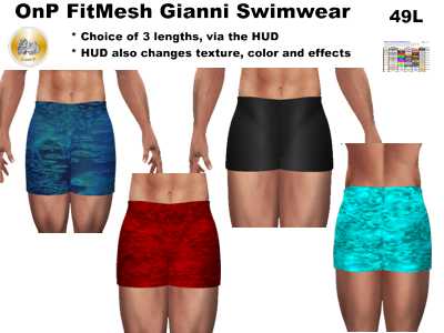 This fitted mesh comes with a HUD and can be adjusted to 3 lengths. The HUD also can change texture or color, or our favorite, which is combinational change of texture and color to create swimwear like textures.
